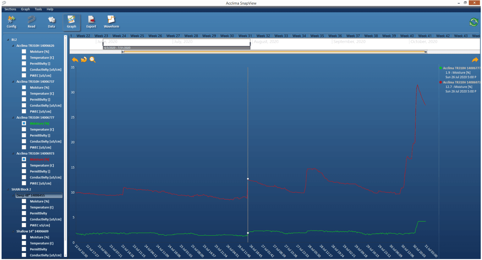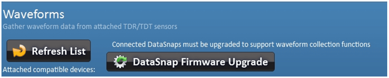 Acclima TDT and TDR sensors all use time-domain analysis of an electromagnetic wave propagated along the waveguide to derive measurement data. Some scientists or advanced users may wish to do their own analysis of waveform data, and so the Waveforms feature was added to the SnapView software to provide access to sensor waveforms. To access this new feature, the SnapView software and connected logging devices (DataSnap and Solar DataSnap) may need to be upgraded.