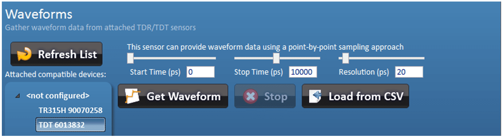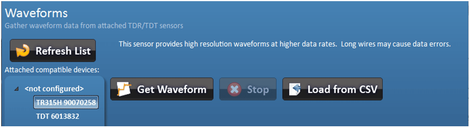 - Acclima sensors that have “Waveform Capture” printed on the label will support fast waveform capture – providing full resolution waveform data in only a few seconds of download time. Older Acclima sensors can also provide waveform data, but only one data point at a time. On these sensors, full resolution waveforms may take 15 minutes to gather, during which time the sensor cannot be disturbed. Reducing resolution and span of the waveform data can dramatically speed up the waveform gathering time for these sensors.