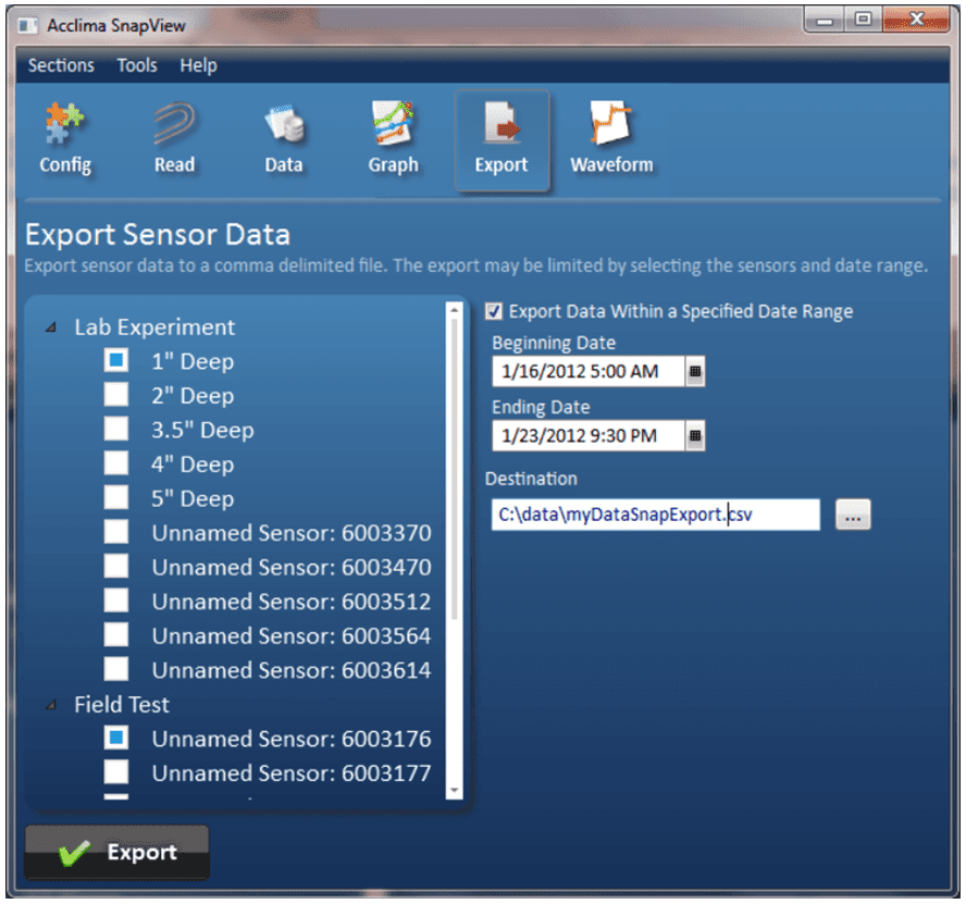As an example, in Figure 26, two sensors have been selected. The first selected sensor is named ‘1” Deep’ and is associated with the DataSnap named ‘Lab Experiment’. The second selected sensor is named ‘Unnamed Sensor: 6003176’ and is associated with the DataSnap named ‘Field Test’. Only data between 5am on January 16, 2012 and 9:30pm on January 23, 2012 will be exported. The output file will be named myDataSnapExport.csv and will be saved in the ‘C:\data\’ folder.