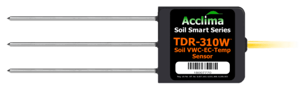 The TDR-310W is a modification to the Acclima TDR-315N. Its shorter rods allow it fit in standard rockwool blocks. It is a complete integrated time domain reflectometer that combines ultra-fast waveform generating and digitizing functions with a precision 5 pico-second resolution time base and highly sophisticated waveform digitizing and analyzing firmware that provides true time domain analysis of soil-propagated waveforms. Its form factor is designed for shallower horizontal installations where it is forced into the sidewall of a trench that has been dug to the desired measurement depth.