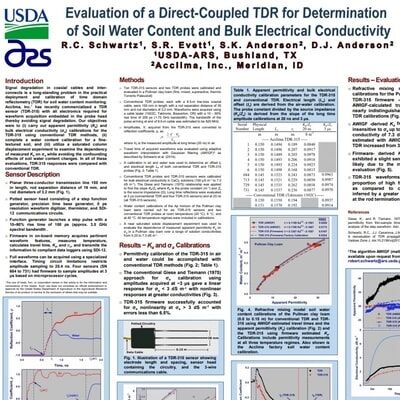 Poster showing showing the results of Dr. Robert Schwartz’ evaluation of the Acclima True TDR-315. The conclusion of this study is that the TDR-315 is as accurate as a conventional TDR using a Tektronix cable tester. We here at Acclima find this report interesting in view of the fact that the Acclima TDR-315 is much less expensive and easier to use than conventional TDR.