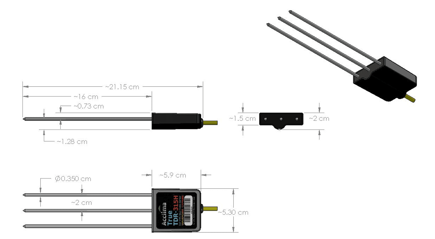 The TDR-315H is one of Acclima’s H-series sensors, which are very low power and suited perfectly for power-conscious applications. Being part of the Soil Smart Series means that its advanced waveform analysis works with all mineral soil types. It is a complete integrated time domain reflectometer that combines ultra-fast waveform generating and digitizing functions with a precision 5 pico-second resolution time base and highly sophisticated waveform digitizing and analyzing firmware that provides true time domain analysis of soil-propagated waveforms. Its longer waveguides provide a very large sampling volume and high accuracy of the waveform propagation.